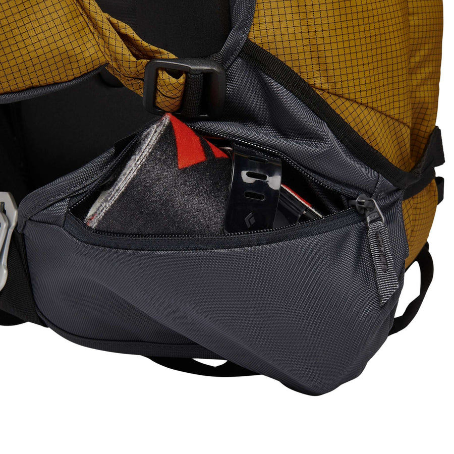 Large hip-belt pockets are purpose-built to store skins for the downhill, and exterior attachment points now accommodate skis, snowboards, helmet, and piolets.
