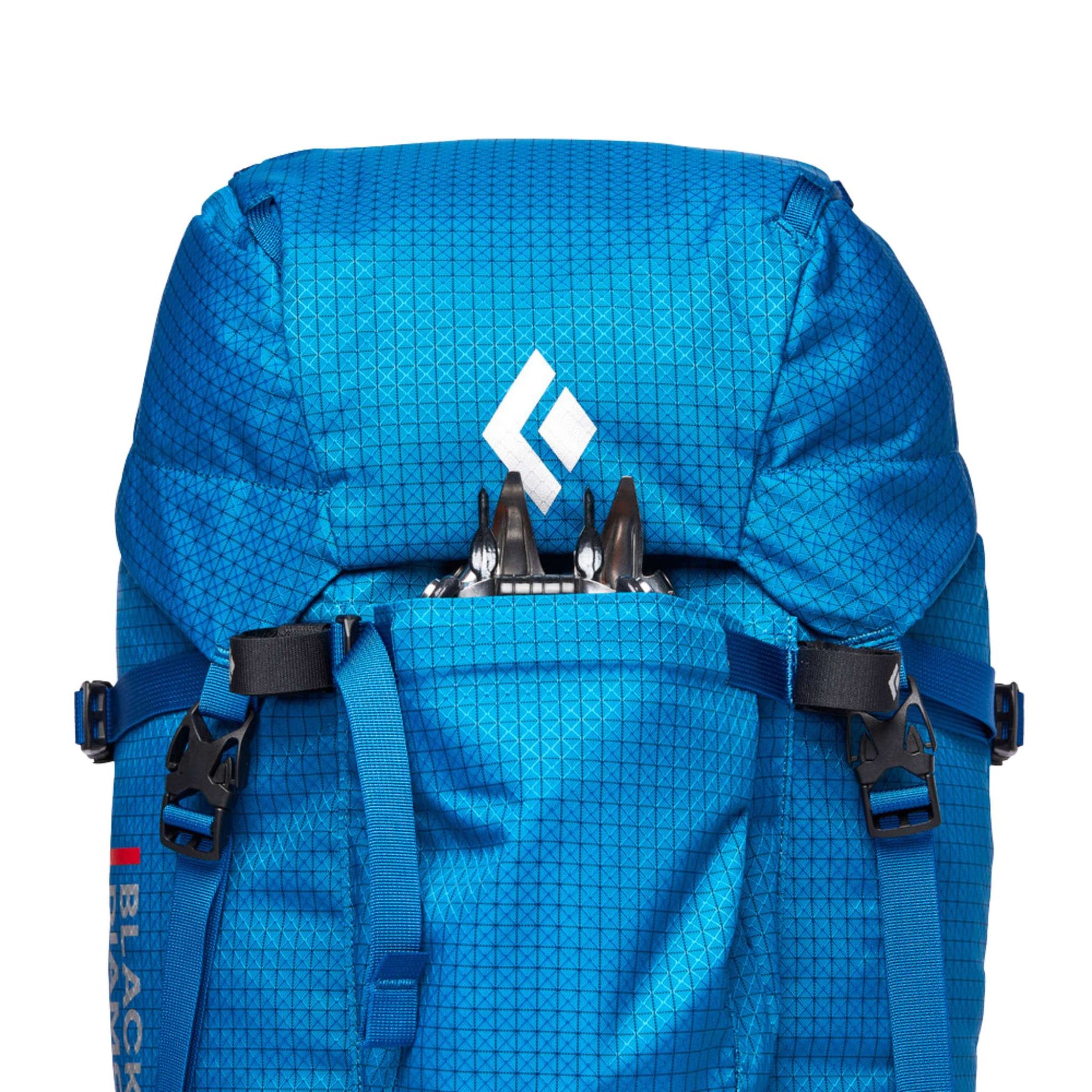 The new custom metal dogbone ice tool attachment provides secure attachment for technical ice tools and mountaineering axes while a front crampon pouch and a tuck-away rope strap secure gear to the outside.