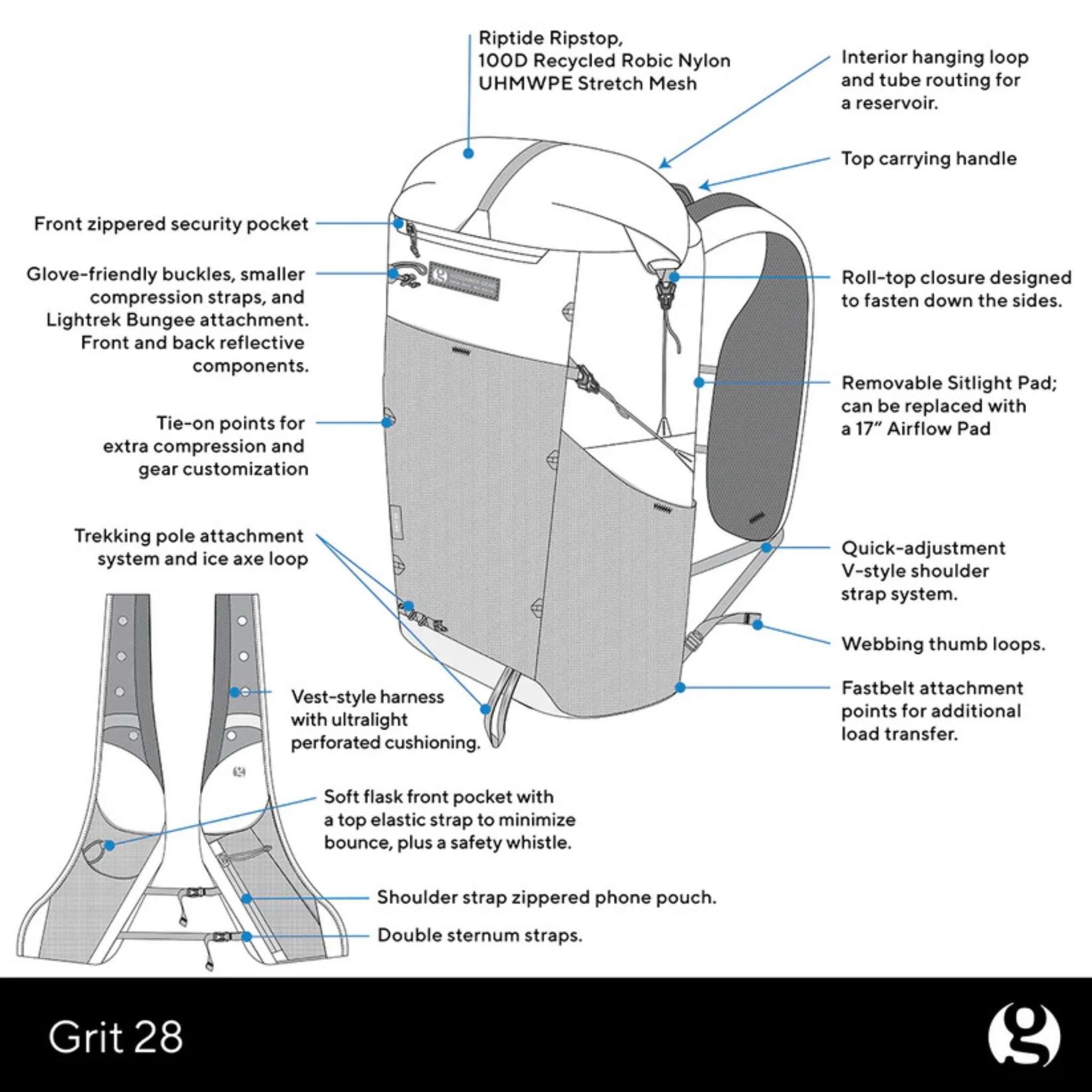 Stay (ultra) light on your feet with the Grit 28L Fastpack. Its streamlined design, refined buckles, and vest-style harness shave base weight ounces without compromising comfort, so you can shave seconds off your personal record.