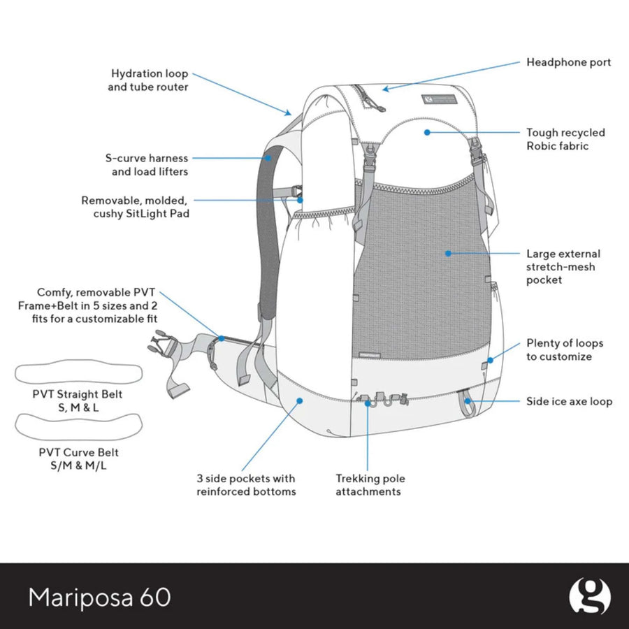 This world-famous pack weighs a little and hauls a lot. Recycled Robic nylon resists cuts and tears. Ample pockets make organization a breeze. The Mariposa is sized for big trips, bear canisters, and serious mileage.