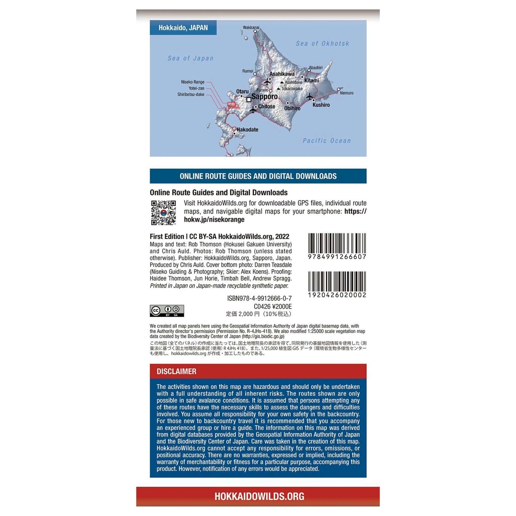 Using high-detail Japanese government topographical map data and captivating cartography, the map outlines over 50 backcountry ascent and descent ski routes in the unique, powder-paradise volcanic terrain of the Niseko region. The map includes comprehensive information about safety, terrain, weather, and parking. Includes aerial photos of popular backcountry runs. QR codes are included for detailed route guides posted on HokkaidoWilds.org. Printed in Japan on Japan-made, tear-resistant, waterproof, recyclable paper. Sold either folded (11cm x 22cm) or flat unfolded. Published by HokkaidoWilds.org, Hokkaido’s largest online database of wilderness adventure information.