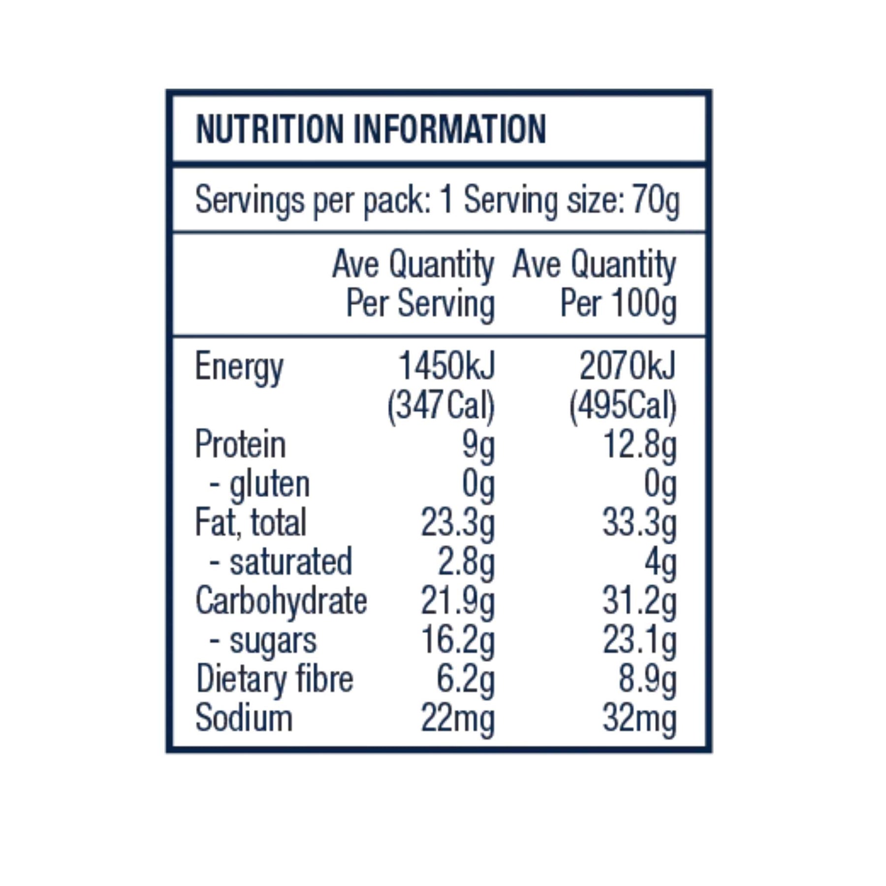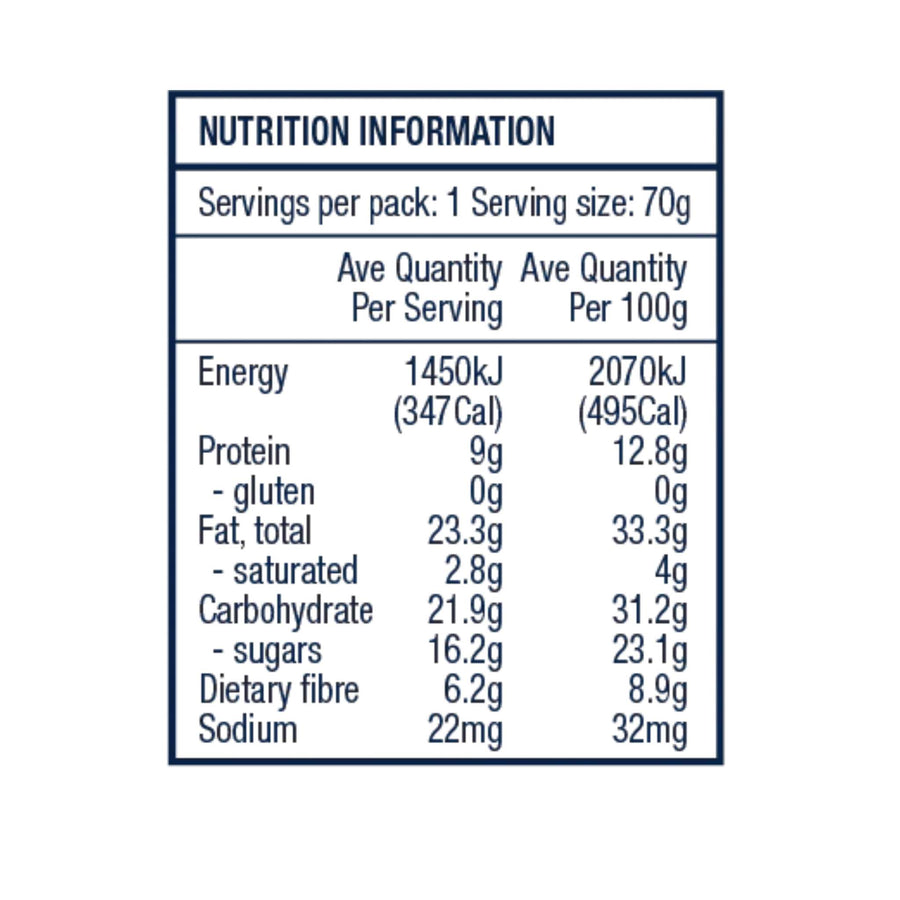 Paired with our signature blend of nutritious grains and seeds, yet formulated without oats or gluten-containing cereals, this bar is totally gluten-free and suitable for coeliacs.